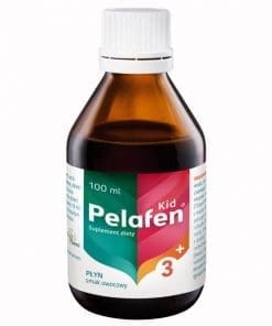 Suplement diety Pelafen Kid w postaci syropu, który zawiera w swoim składzie ekstrakty z kwiatów, oraz soki owocowe.