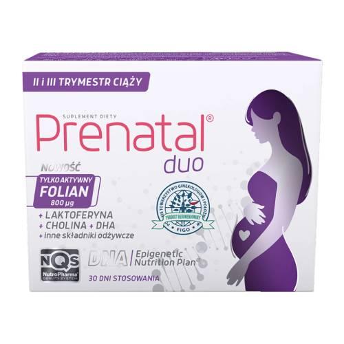 Prenatal DUO to suplement diety dla kobiet w II i III trymestrze ciąży. Zawiera laktoferynę i żelazo, a także cholinę, DHA i kompleks niezbędnych składników wyselekcjonowanych pod względem korzystnego wpływu na matkę i dziecko, w odpowiednio wysokich porcjach rekomendowanych przez ekspertów, w tym PTGiP. Zgodnie z aktualnymi zaleceniami Prenatal DUO zawiera tylko aktywną formę folianów (L-metylofolian wapnia) w rekomendowanej dziennej porcji 800 μg.